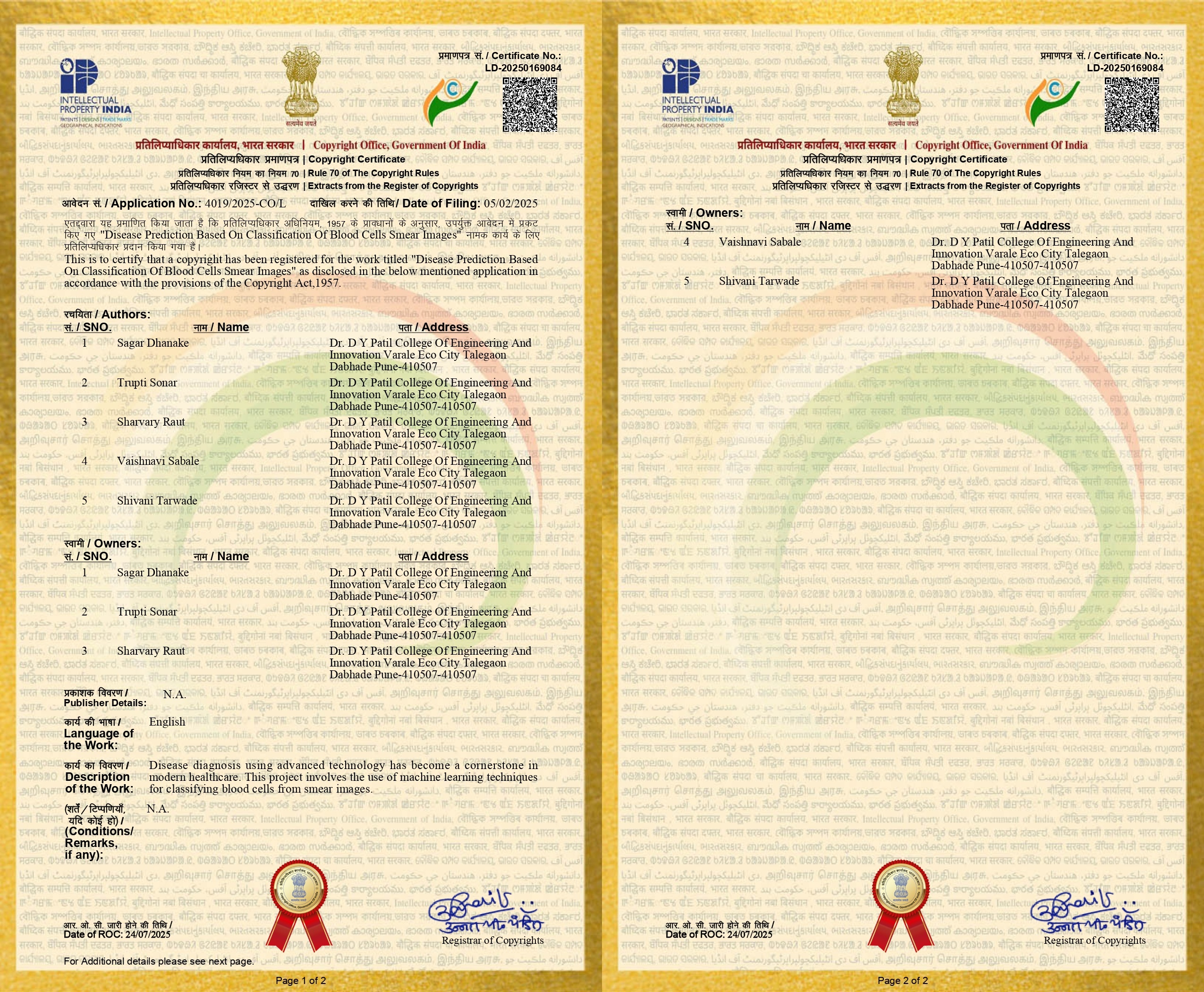 - Register copyright with a registration number L-89113/2020, "Blockchain Based Digital Crime Record Management System", Jan 2020