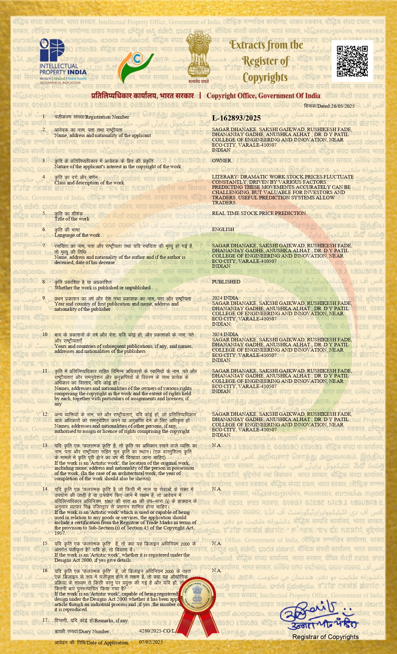 - Register copyright with a registration number L- 162893/2025, “Real Time Stock Price Prediction”, March 2025.